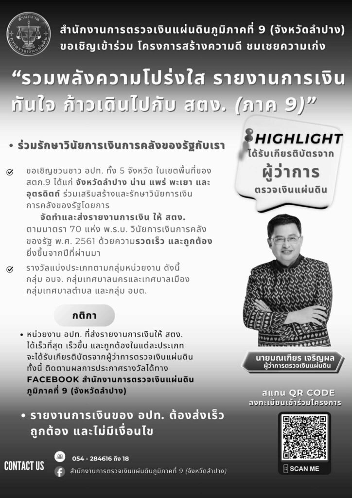 สำนักงานการตรวจเงินแผ่นดินภูมิภาคที่ 9 (จังหวัดลำปาง) ขอเชิญเข้าร่วม โครงการสร้างความดี ชมเชยความเก่งกิจกรรมประชาสัมพันธ์, ข่าวที่น่าสนใจ, ข่าวประชาสัมพันธ์พฤศจิกายน 12, 2025พฤศจิกายน 12, 2025 Post Views: 42 “รวมพลังความโปร่งใส รายงานการเงินทันใจ ก้าวเดินไปกับ สตง.(ภาค9)