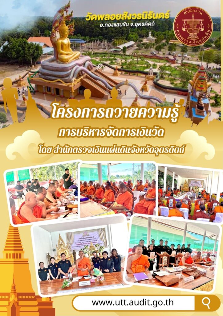 ในวันจันทร์ที่ ๑ ธันวาคม ๒๕๖๘ นางสาวกมลรัตน์ จันทร์นนท์ ผู้อำนวยการสำนักตรวจเงินแผ่นดินจังหวัดอุตรดิตถ์ พร้อมด้วยข้าราชการและลูกจ้างของสำนักตรวจเงินแผ่นดินจังหวัดอุตรดิตถ์ “จัดกิจกรรมโครงการถวายความรู้การบริหารจัดการเงินวัด” ณ วัดพลอยสังวรนิรันทร์ ตำบลป่าคาย อำเภอทองแสนขัน จังหวัดอุตรดิตถ์กิจกรรมอื่น ๆ, ข่าวที่น่าสนใจ, ข่าวประชาสัมพันธ์, ภาพกิจกรรมธันวาคม 1, 2025 Post Views: 37